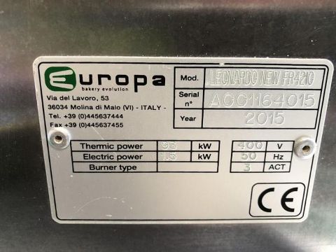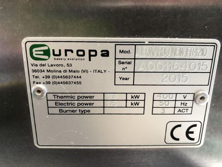 1 x Europa Stone Bake deck oven, YOM 2015, Model Leonardo New FR4210, 4 decks each holding up to 3 trays, complete with integrated loader. Fitted with optional stainless steel panels. Full spec sheet available, Buyer to Remove. UKFM2-3155